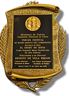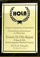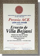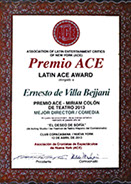 2017 Nominado por “Artistas de Teatro Independiente de Nueva York” como: "Mejor director" Por su trabajo en “Rose of two sense” de Emilio Carballido 2015 Premiado en "El Quinto Festival de teatro del Comisionado dominicano de cultura de Nueva York" como: “Mejor Producción” “Mejor diseño de vestuario”, por su trabajo en “La que hubiera amado tanto / The one that should have loved” by Alejandro Licona Nominado por “Premio Arte” como: "Mejor director en teatro" por su trabajo en “La que hubiera amado tanto / The one that should have loved” by Alejandro Licona 2013 Premiado por Asociación de Cronístas de Espactáculos de Nueva York A.C.E. como: “Mejor director” por su trabajo en “El deseo de Sofía / Sofía's desire” Escrita y dirigida por Ernesto De Villa Bejjani Premiado por “Premio Arte” como “Mejor director” por su trabajo en “El deseo de Sofía / Sofía's desire” Escrita y dirigida por Ernesto De Villa Bejjani Awarded by Hispanic Organization of Latin Actors H.O.L.A. como Outstanding Achievement in Direction por la obra “El deseo de Sofía / Sofía's desire” Escrita y dirigida por Ernesto De Villa Bejjani 2012 Premiado "El Tercer Festival de teatro del Comisionado dominicano de cultura de Nueva York" como: “Mejor Director” “Mejor Production” “Mejor Escenografía” por su trabajo en “El deseo de Sofía / Sofía's desire” Write and directed by Ernesto De Villa Bejjani 2010 Premiado por Asociación de Cronístas de Espactáculos de Nueva York A.C.E. como: “Mejor Actor Dramatico” por su trabajo en “El beso del adíos” de Tencha Avila, Dirigida por Jerry Ruiz 2008 Nominado por Asociación de Cronístas de Espactáculos de Nueva York A.C.E. como: “Mejor Actor Dramatico”. Premiado por Hispanic Organization of Latin Actors H.O.L.A. como: Outstanding Performer by male actor, por la obra “En ningún lugar de la frontera, Nowhere on the border” de Carlos Lacamara, Dirigida por Jose Zayas 2004 Premiado por Asociación de Cronístas de Espactáculos de Nueva York A.C.E. como: "Actor Revelación del año". por su trabajo en “Lo Mein con Tequila” Dirigida por Gloria Zelaya
