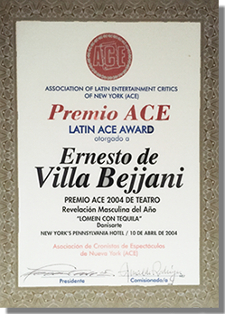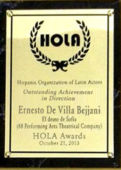 2017 Nominated by “Artistas de Teatro Independiente ” as: "Best director" for his work at “Rose of two sense” by Emilio Carballido 2015 Awarded at "The Fifth Hispanic Festival of Dominican Commissioner of Culture of New York” as: “Best Production” “Best Costume design”, for his work at “La que hubiera amado tanto / The one that should have loved” by Alejandro Licona Nominated by “Premio Arte” as: Best director in theatre New York for his work at “La que hubiera amado tanto / The one that should have loved” by Alejandro Licona 2013 Awarded by The Association of Latin Entertainment Critics of New York A.C.E. as: “Best director” for his work “El deseo de Sofía / Sofía's desire” Write and directed by Ernesto De Villa Bejjani Awarded by “Premio Arte” as Best director in theatre New York for his work “El deseo de Sofía / Sofía's desire” Write and directed by Ernesto De Villa Bejjani Awarded by Hispanic Organization of Latin Actors (H.O.L.A.) as Outstanding Achievement in Direction for the play “Sofia’s desire” . 2012 Awarded at "Third Hispanic Festival of Dominican Commissioner of Culture of New York" as: “Best Director” “Best Production” “Best Set design” for his work “El deseo de Sofía / Sofía's desire” Write and directed by Ernesto De Villa Bejjani 2010 Awarded by The Association of Latin Entertainment Critics of New York A.C.E. as: “Best Actor Drama” for his work at “El beso del adíos” by Tencha Avila, Directed by Jerry Ruiz 2008 Nominated by The Association of Latin Entertainment Critics of New York A.C.E. as: "Best drama actor". Awarded by Hispanic Organization of Latin Actors H.O.L.A. as: Outstanding Performer by male actor, for the play “En ningún lugar de la frontera, Nowhere on the border” by Carlos Lacamara, Directed by Jose Zayas 2004 Awarded by The Association of Latin Entertainment Critics of New York A.C.E. as: "Male Actor Revelation of the Year". For his work at “Lo Mein con Tequila” Directed by Gloria Zelaya