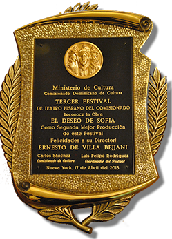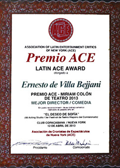 2017 Nominado por “Artistas de Teatro Independiente de Nueva York” como: "Mejor director" Por su trabajo en “Rose of two sense” de Emilio Carballido 2015 Premiado en "El Quinto Festival de teatro del Comisionado dominicano de cultura de Nueva York" como: “Mejor Producción” “Mejor diseño de vestuario”, por su trabajo en “La que hubiera amado tanto / The one that should have loved” by Alejandro Licona Nominado por “Premio Arte” como: "Mejor director en teatro" por su trabajo en “La que hubiera amado tanto / The one that should have loved” by Alejandro Licona 2013 Premiado por Asociación de Cronístas de Espactáculos de Nueva York A.C.E. como: “Mejor director” por su trabajo en “El deseo de Sofía / Sofía's desire” Escrita y dirigida por Ernesto De Villa Bejjani Premiado por “Premio Arte” como “Mejor director” por su trabajo en “El deseo de Sofía / Sofía's desire” Escrita y dirigida por Ernesto De Villa Bejjani Awarded by Hispanic Organization of Latin Actors H.O.L.A. como Outstanding Achievement in Direction por la obra “El deseo de Sofía / Sofía's desire” Escrita y dirigida por Ernesto De Villa Bejjani 2012 Premiado "El Tercer Festival de teatro del Comisionado dominicano de cultura de Nueva York" como: “Mejor Director” “Mejor Production” “Mejor Escenografía” por su trabajo en “El deseo de Sofía / Sofía's desire” Escrita y dirigida por Ernesto De Villa Bejjani 2010 Premiado por Asociación de Cronístas de Espactáculos de Nueva York A.C.E. como: “Mejor Actor Dramatico” por su trabajo en “El beso del adíos” de Tencha Avila, Dirigida por Jerry Ruiz 2008 Nominado por Asociación de Cronístas de Espactáculos de Nueva York A.C.E. como: “Mejor Actor Dramatico”. Premiado por Hispanic Organization of Latin Actors H.O.L.A. como: Outstanding Performer by male actor, por la obra “En ningún lugar de la frontera, Nowhere on the border” de Carlos Lacamara, Dirigida por Jose Zayas 2004 Premiado por Asociación de Cronístas de Espactáculos de Nueva York A.C.E. como: "Actor Revelación del año". por su trabajo en “Lo Mein con Tequila” Dirigida por Gloria Zelaya